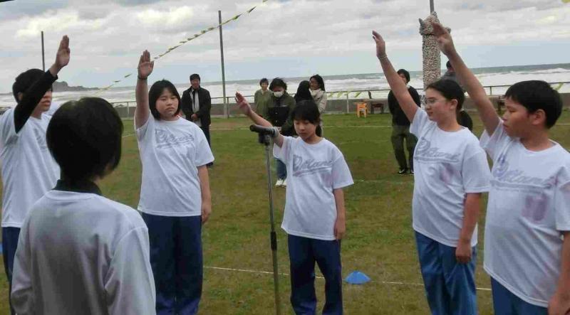 17:30…避難所の子どもたちが夕飯を待つ時間帯。集まって楽しそうに遊ぶことが恒例となっています。この日は、校舎内に子どもたの校歌の声が聞こえていました。校長室で保護者の方とお話をしていた時に、子どもたちの元気な校歌の声が聞こえてきて、思わず二人で笑顔になりました。何をしながらみんなで校歌を歌っていたのやら…「永久(とわ)に輝く 北斗星 漆黒照らすは 月明かり 風の香 かおる大谷に 生きる健児の 意気高し 夢と人の和誇らかに のびゆく学び舎 創りなむ」・・・胸に響きました。遠くなった海はこの日はきれいな青色でした。先週の青空の下での縄跳び練習の写真もご紹介いたします。