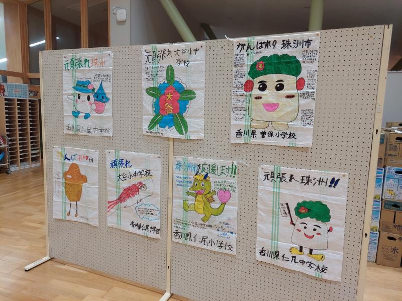 珠洲市を代表するゆるキャラの「みつけたろう」や大谷小中学校の校章、私たちが作った鯉のぼりなどが