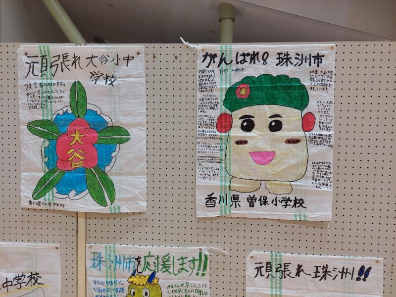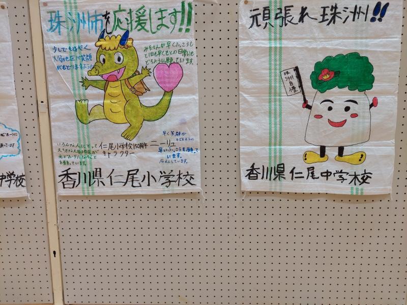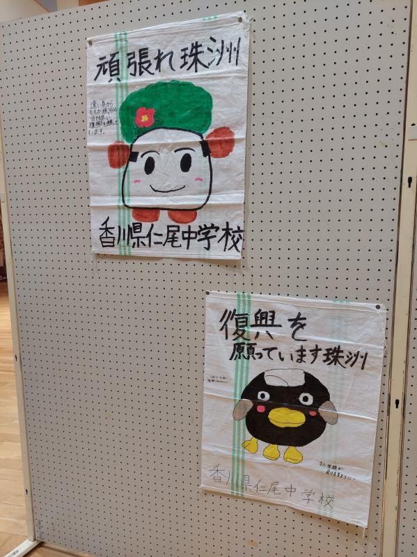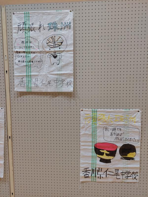 先日、香川県三豊市立仁尾中学校様と仁尾小学校様、曽保小学校様より励ましのメッセージが書かれた「土のう袋」が届きました。