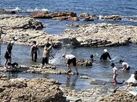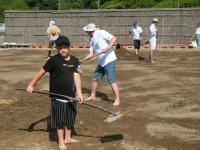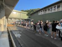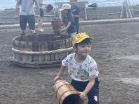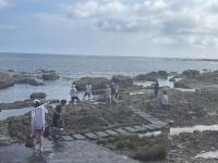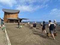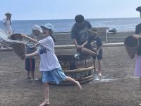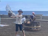 恒例の塩田体験が行われました。75名が参加し、潮風に吹かれながら塩づくりに汗を流しました。途中、海での水遊び体験もプラスされ、子どもたちの歓声と笑顔がはじける体験活動となりました。暑さが心配されましたが、過ごしやすい中での作業となり、安全に実施できました。お昼は、飯盒でのご飯炊きやレクリエーション大会が行われ、カレーやサラダ等をおいしくいただきました。ランチルームでマイ塩を焚き上げました。塩の結晶の観察も行いながら、自然の神秘を体験した時間でもありました。閉会式では、9年生がにこやかに感想を発表しました。たくさんのご準備を頂いた総括委員会の皆様、ありがとうございました。