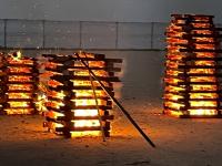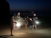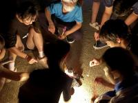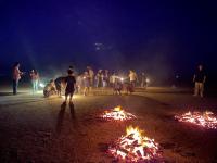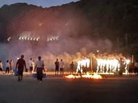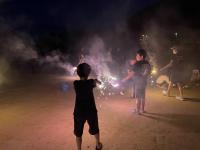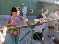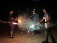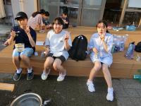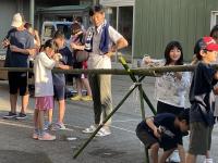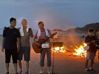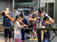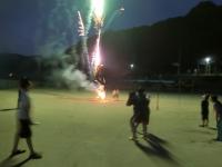 塩田体験終了後、学校の中庭で、流しそうめんが行われました。青年福祉委員の皆様の企画で、竹を割る作業からスタートしました。子どもたちは、塩田の疲れも見せず、コロナ対策も兼ねて一人ずつ渡されたマイ・トングを活用しながら、流れるそうめんをキャッチすることを楽しんでいました。そして、もりもり食べていました。その後、海に沈む夕日の美しいグラウンドでは、キャンプファイヤーの火がともされ、亀山様・川端様のギター演奏に聞き入りました。しょうまさんが飛び入りで歌を披露しました。日がすっかり沈む頃には、仕掛け花火や手持ち花火を楽しみ、グラウンドには花火の夏の匂いが広がっていました。青年福祉委員の皆様、素敵な企画と時間をありがとうございました。