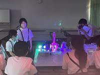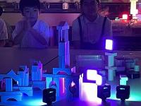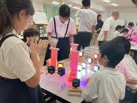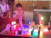芸術祭での捜索活動に関わられる造形作家の泰然様をお迎えして、「あかりのありか≪のと≫」に向けてのワークショップが開催されました。白木の積み木に様々な色のLEDライトをあて、珠洲に伝わる歴史や自然を表現する取組です。今回は、前期課程の子供たちがキリコ祭りを表現することとなりました。部屋の照明を消して浮かび上がった自分たちの作品に歓声を上げていました。創造的な活動の楽しさを味わい、夏休みの作品作りへの参加に意欲をもった様子でした。