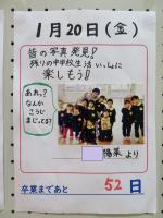 9年生はまもなく受験、そして卒業を迎えます。在校生・保護者・地域の皆様にご協力いただき、思い出を振り返ったりエールをおくったりするカウントダウンカレンダーを作成しています。朝の会で9年生に紹介し、その後だんだん広場に掲示しています。9年生はもちろんですが、在校生も楽しみながら眺めています。皆様、ご協力ありがとうございます。ご来校の折にご覧いただけましたら幸いです。