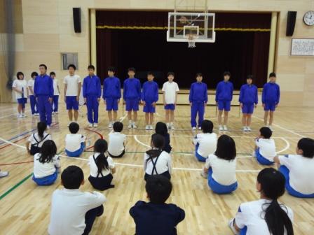 卒業式に向けて、8年生がリーダーとなって、後輩の指導をしています。全体に指示を出して、動かし、感想や改善点を伝えるなど、リーダーとしての風格が出てきました。いいコンビのふたりです。