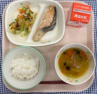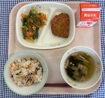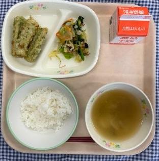 今日の給食献立は、白ごはん・ちくわのいそべ揚げ・白菜のおかか和え・里芋と大根のみそ汁・牛乳でした。
