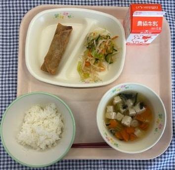 今日の給食献立は、白ごはん・春巻き・もやしのピリ辛ナムル・春雨スープ・牛乳でした。