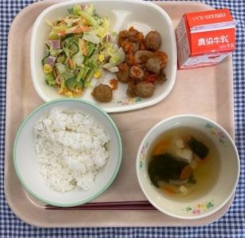 今日の献立は、白ごはん・ミートボールのトマトソースがけ・ドレッシングサラダ・豆腐と小松菜のスープ・牛乳でした。