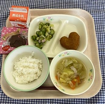 今日の給食献立は、白ごはん・ハートのコロッケ・グリーンサラダ・キャベツとベーコンのスープ・チョコカップケーキ・牛乳でした。