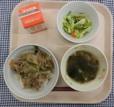 今日の給食献立は、牛丼・あっさり漬け・わかめとなめこのみそ汁・牛乳でした。