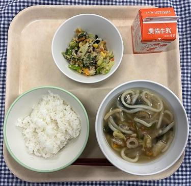 今日の給食献立は、白ごはん・小松菜とツナの和え物・五目うどん・牛乳でした。