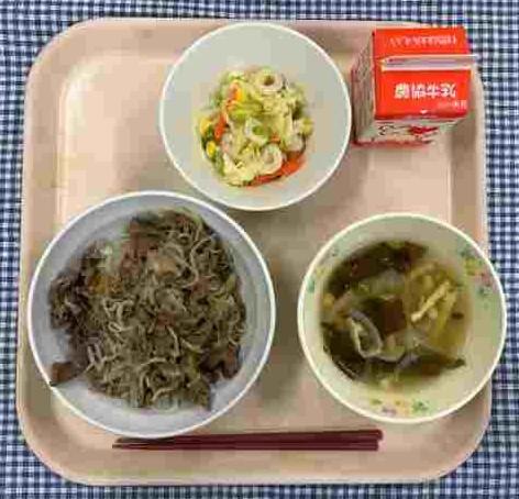 今日の献立は、能登牛牛丼・キャベツとちくわの酢みそ和え・わかめと揚げのみそ汁・牛乳です。
