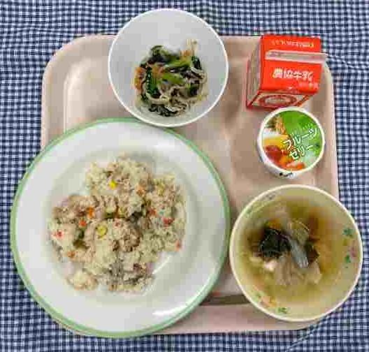 今日の献立は、五目チャーハン・三色ナムル・春雨スープ・フルーツゼリー・牛乳でした。