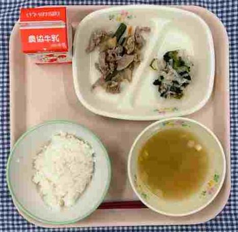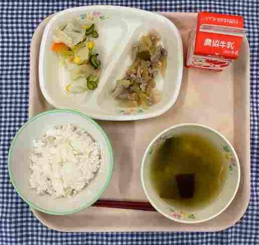 今日の献立は、白ごはん・豚肉のみそ炒め・あっさりピクルス・えのきのみそ汁・牛乳です。