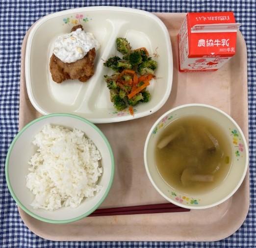 給食献立は、白ごはん・チキン南蛮・ブロッコリーのおかか和え・ごぼうとしめじのみそ汁・牛乳でした。
