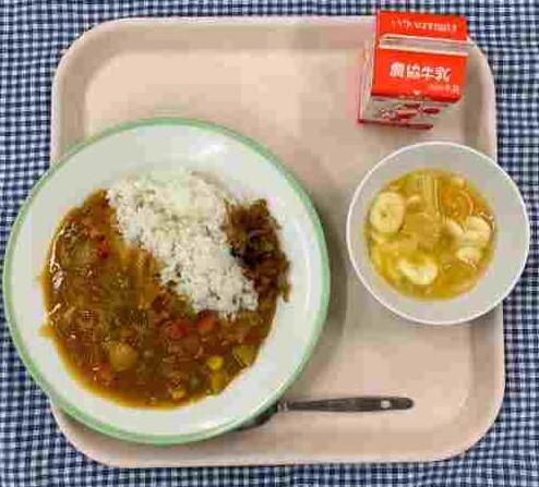 今日の献立は、麦ごはん・ポークカレー・フルーツポンチ・福神漬け・牛乳でした。