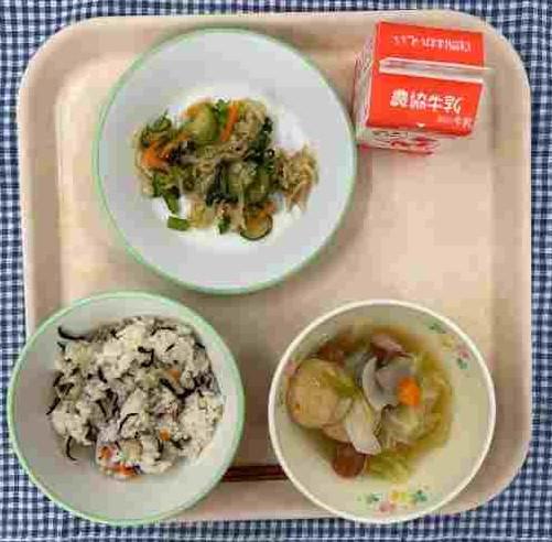 今日の献立は、ひじきツナごはん・はりはり和え・洋風おでん・牛乳でした。
