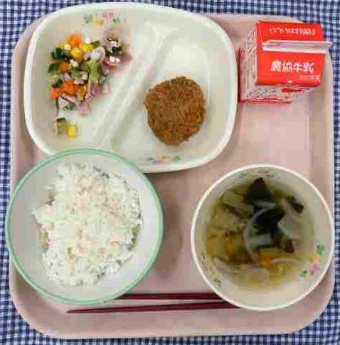 今日の献立は、白ごはん・ヒレカツ・マセドアンサラダ・大根のコンソメスープ・牛乳でした。