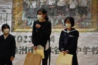 読書量の豊かな児童生徒の表彰のために、大谷子どもを育てる会・会長の丸山様と公民館主事・南様がご来校くださいました。学校全体として読書量の多かったみふゆさん、ひなさんが表彰され、「本を読むと心が落ち着きます。これからもたくさん本の世界に触れたいです。」とお礼の挨拶を行いました。学年ごとの表彰も行われ、副賞に図書券を頂きました。いつも子どもたちのために、ありがとうございます。