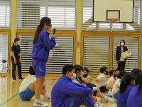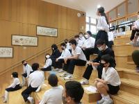 縄跳び集会を行いました。避難所となっている体育館にスペースを作っていただき、皆さんに見守られながらの集会となりました。地域のS平さんは、T谷さんに散髪してもらいながら子どもたちの縄跳びを観戦してくださいました。なかなか見られないシチェーションで、今しか出会えない光景も楽しみました。ボランティアの方々や金沢から来てくださった養護教諭のÝ先生も参加してくださり、みんなで楽しみました。八の字跳びに混ぜてもらったところ、美冬さんがそっと背中を押して入るタイミングを教えてくれました。やさしさがありがたかったです。