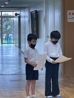 2年生の司会で、児童・生徒集会を行いました。担任の先生と準備をして、大きな声で堂々と各委員会からのお知らせ発表の進行を行いました。執行委員会からは、立ち止まって元気な挨拶をすることの提案、放送委員会からは毎朝の放送で話す時のポイント、図書委員会からは、本のページごとに貼られるこいのぼりのうろこがなかなか増えないことへの呼びかけがありました。恒例の感想発表もしっかりできました。田中先生からは、「ルールはみんなで納得してつくる」ことについての問いかけがありました。「廊下は走ってもよい」「廊下は走ってはいけない」について、理由を添えて意見を書くことから始まっています。正直に思いを伝えてくれている子どもたちです。まもなく話し合い第2弾が行われます。