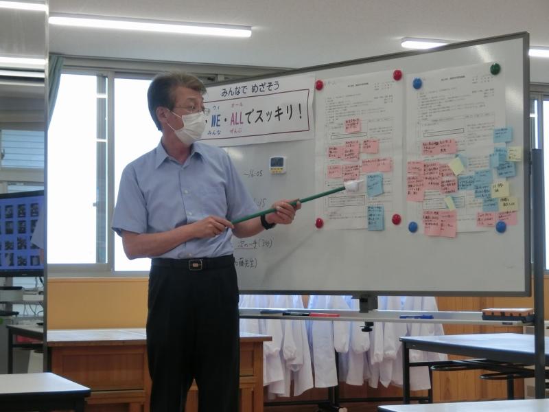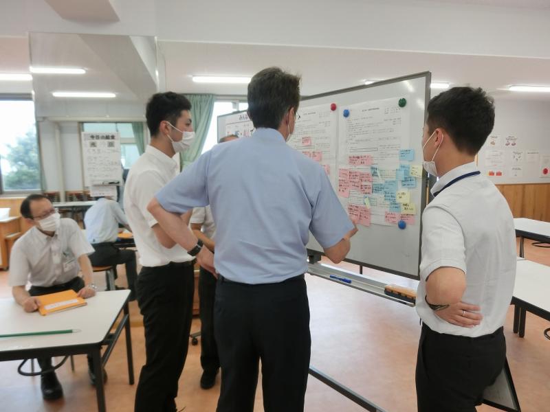 職員が、グループで相談しながら子どもたちにとって分かりやすい掲示物作りを行っていました。みんなで一つの事に取り組む姿は楽しそうです。子どもたちにも問題を協働的に解決できる力をつけることをめざします。