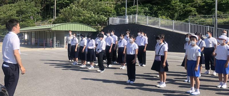 6限目に避難訓練を行いました。 避難訓練は、緊急時に人命を最優先できる判断力と行動力を鍛え、安全に避難することを目的として、年3回計画しています。今回は、火災を想定し、教職員集団が自分の動きを把握し、子ども達に適切な指示を出し、避難させることをねらいとして行いました。あらかじめの分担は行わず、アクションカードをもとに子どもたちを避難させることにチャレンジしました。教職員は、緊張感を持って取り組むことができていました。子ども達は先生方の指示を聞き、どう行動すべきかを理解し、行動できていました。 子どもたちの行動は、はなまるでした。避難放送から全員避難までの時間は2分5秒でした。 講評として、大門教諭が「先に避難した人たちが静かに待っていたのがよかった。」と話し、轟教諭が「いつどんなときでも確実に行動できるようにしましょう」と呼び掛けてくれました。