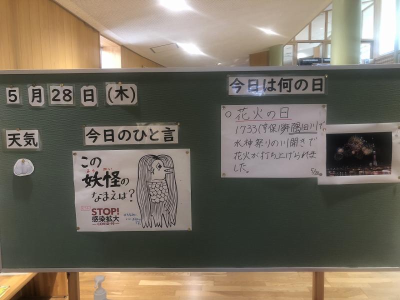 今日のメッセージボードは、西養護教諭が担当しました。初のクイズ形式の掲示板となりました。厄よけの妖怪の名前は?アマビエだそうです。
