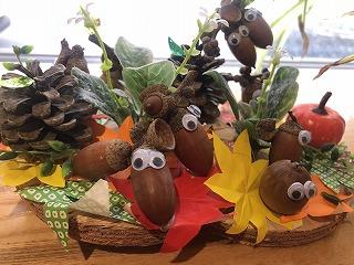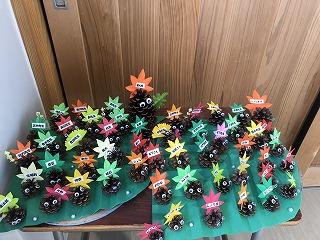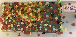 二谷調理員、打越調理員による11月の掲示をご紹介します。子どもたち全員の名前を入れて作成してあります。とてもかわいく温かい作品のおかげで廊下が華やかになります。松ぼっくりやどんんぐり、一つ一つにつけてある目が愛らしいです。