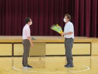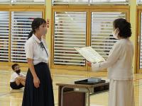 石川県中学校体育大会 スローガンの部で、7年 あこさんの作品が優秀賞を受賞しました。5千点の応募からの受賞です。いろいろな分野への挑戦は素敵です。夏休みを利用して、全校児童・生徒が、様々な分野への応募に挑戦しくれるものと思います。20日に表彰状を手渡しました。おめでとうございます。