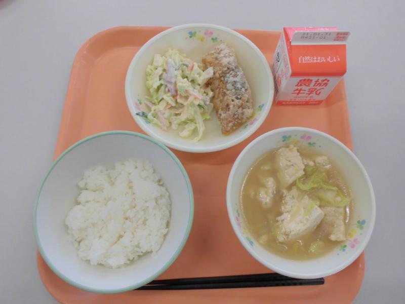 【珠洲の魅力まんさい給食:ごはん 魚の竜田揚げ 野菜サラダ けんちん汁 牛乳】