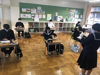 今日は、三崎中学校と交流学習を行いました。国語の授業では、ペア学習をしたり、机を合わせて4人で話し合ったりして、協働して学ぶことで、自分の考えを深めていました。また、総合的な学習の時間では、大谷チャームの制作を一緒に行いました。三崎中学校の生徒のみなさんに作り方やコツを教えることで、自然と会話が弾んでいました。