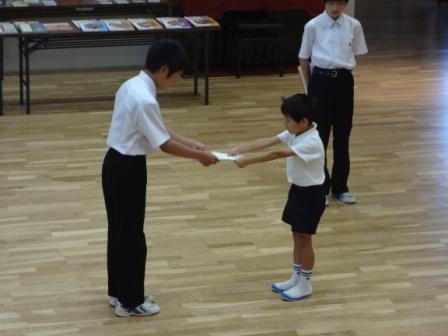 1学期の清潔検査でいちばんハナマルのついた2年生が保健体育委員会から表彰されました。