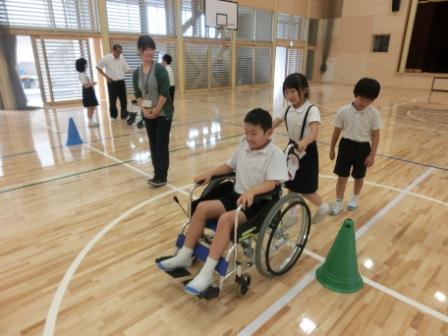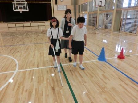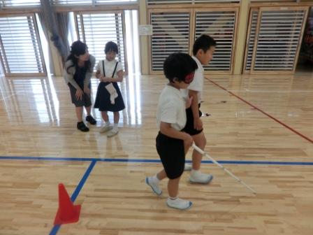 社会福祉協議会の方に教えていただきながら、アイマスクと車椅子の体験をしました。