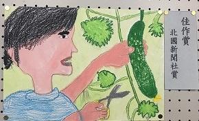 2年あやなさんの農業体験絵画作品が佳作に選ばれ、本日産業センターで表彰されました。市内小学校の91点の応募作品から選ばれました。元気に返事をして賞状を受けとることができていました。食べ物を育てる農業体験を通しての感動や不思議さ、味わった時のおいしさが表現されている作品が市役所の1階ホールに展示されています。