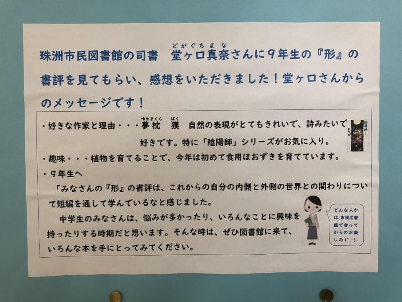 市民図書館の堂ヶ口様から書評(9年生作品)のコメント