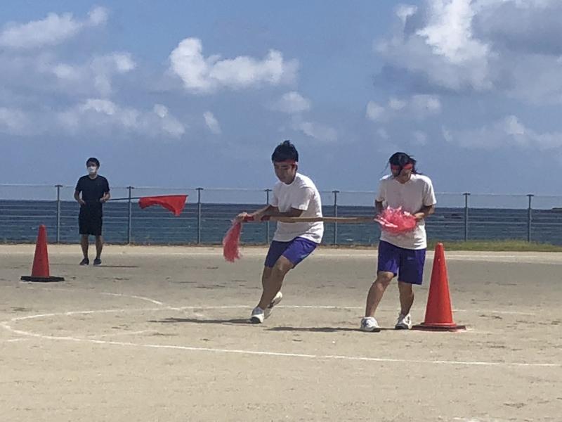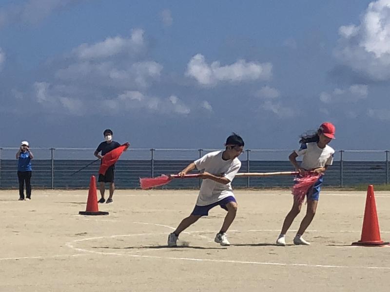 ②保護者の協力体制のすばらしさ。(保護者の皆様と職員全員参加で行われた、ハードで楽しい競技PTA種目「ダンシング玉入れ」。生徒全員リレーでのPTA会長さんと副会長さんの楽しい実況放送。保護者テントには笑いがあふれていました。お二人の実況をまだ聞いていたいという声がありました。更には、たくさんの方が参加しての砂取節の大きな円。後片付けのスピーディな協力。・・・感激しました。)