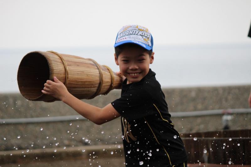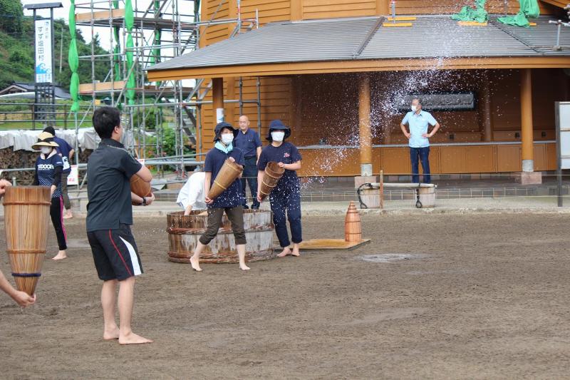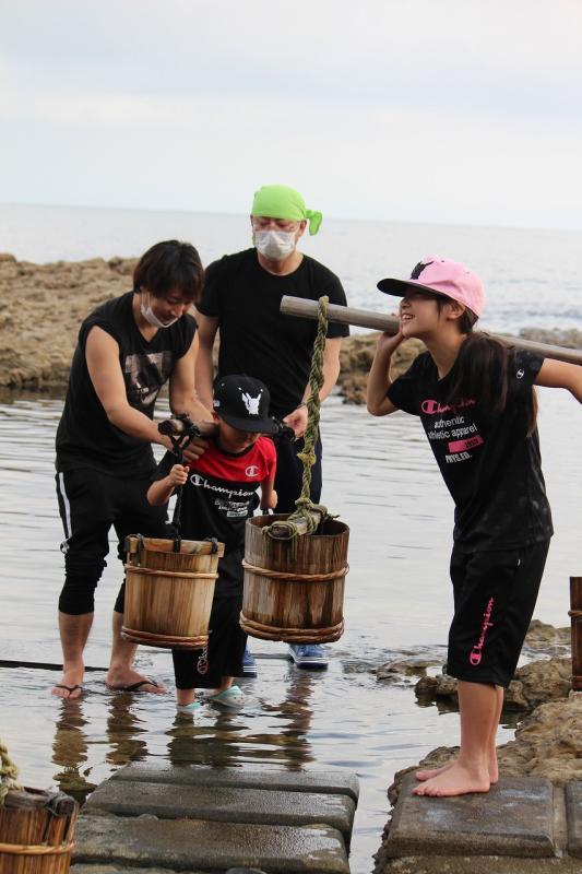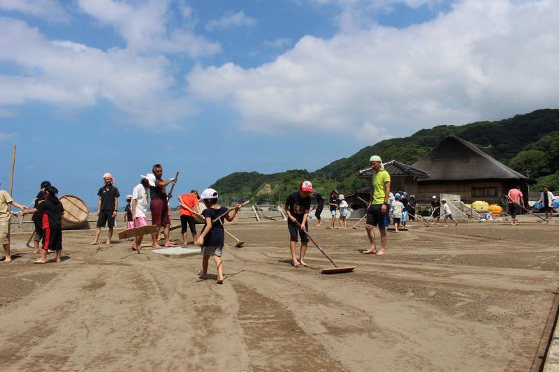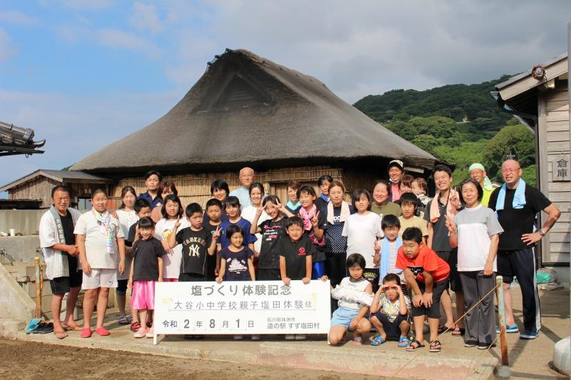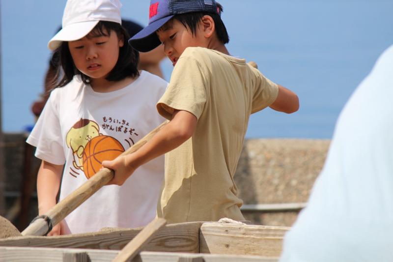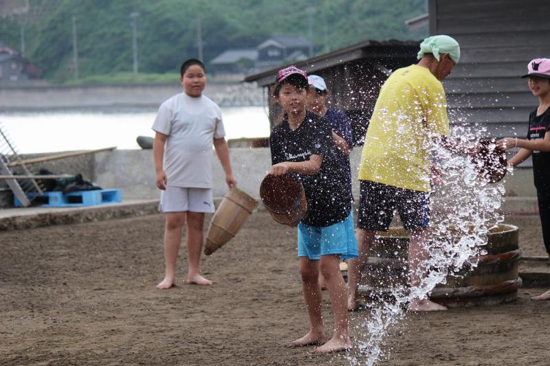朝、塩田村に集合し、水上社長様・浜士の登谷様・水上PTA会長さんのご挨拶のあと、ラジオ体操から活動がスタートしました。海水くみ上げ、しこけへの海水貯め、海水まき、こまざらえでのすじめ入れなど、子どもたちはどの作業も楽しそうに積極的に取り組んでいました。お昼は、飯ごうでごはんを炊くことを教えていただき、昨年度収穫した塩でおにぎりを作りました。お母さん方からのご馳走やデザートも加わりにぎやかでおいしい昼食会となりました。午後からは、カン砂集め、カン砂たれ舟入れ、カン水取り等を行い、今年度は、それぞれのマイコンロと土鍋での塩づくりとなりました。結晶が徐々に固まっていく様子を眺め、子どもたちはいつもと違った感動を味わった様子でした。お世話頂きました塩田村の皆様、総括委員会の保護者の皆様、本当にありがとうございました。お疲れ様でした。「子どもを育てる会」の皆様方から飲み物を、新谷様からとうもろこしを頂きました。ありがとうございました。