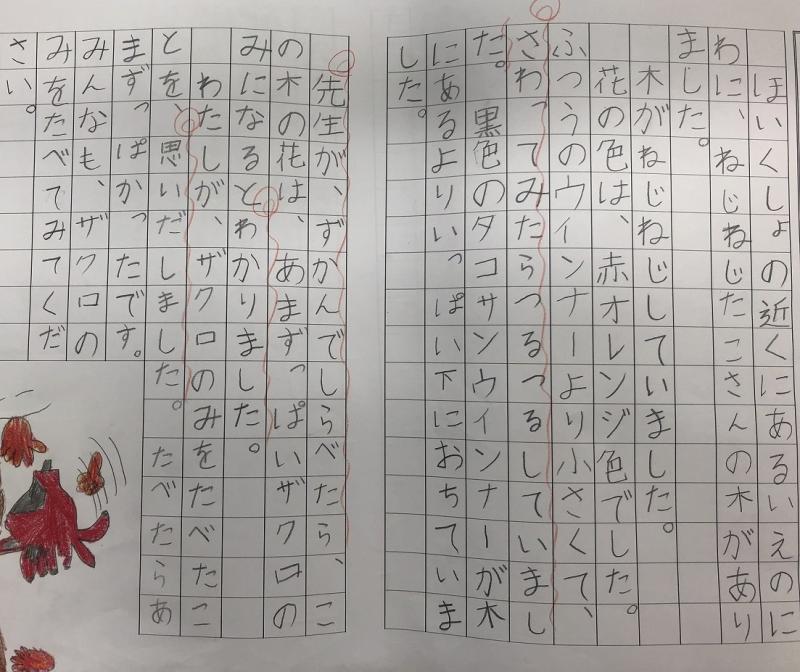 2年生の国語では、メモを取る学習を行っています。その学びを生かして、地域に出かけてみつけた木のメモをもとに作文を書きました。今日はその作文を読んで紹介してくれました。全員、その木の見た目や触った感じ、先生に質問したことや自分の経験を盛り込んで、丁寧な字で書き上げていました。「まるで~ようです。」という比喩表現も上手に使えています。ゆいとさんのタイトルは「タコさんウインナー」でこの木の様子を表しています。こうじさんは「ねじねじウインナー」というタイトルです。何の木だと思われますか?あやなさんの作文を載せておきます。教室に掲示しますので、ご来校の際にご一読いただければ幸いです。