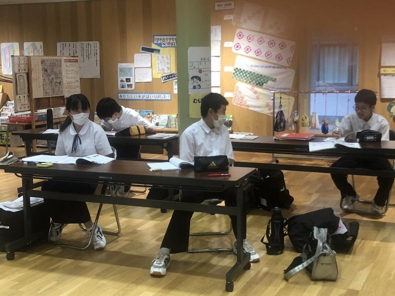 今日から部活動が休みとなり、テスト学習時間の保障が行われています。初めての定期テストとなる7年生は、テスト勉強のコツをつかむために6時まで、学校で残って勉強したいという申し出があり、8年生といっしょにだんだん広場に机を出して、学習に取り組んでいます。3学期には、自宅で自分の家庭学習をコントロールすることを目指しています。