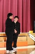 縄跳び集会を行いました。避難所となっている体育館にスペースを作っていただき、皆さんに見守られながらの集会となりました。地域のS平さんは、T谷さんに散髪してもらいながら子どもたちの縄跳びを観戦してくださいました。なかなか見られないシチェーションで、今しか出会えない光景も楽しみました。ボランティアの方々や金沢から来てくださった養護教諭のÝ先生も参加してくださり、みんなで楽しみました。八の字跳びに混ぜてもらったところ、美冬さんがそっと背中を押して入るタイミングを教えてくれました。やさしさがありがたかったです。