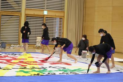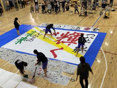 今年度の文化祭で新たに取り組んだことがあります。一つ目は1~9年生までの「ふるさと」の全校合唱です。1題目は前期課程の元気な声で、2題目は後期課程の声の響きの美しさを生かして、3題目は、全員での声の重みを生かして歌うことに挑戦しました。二つ目は、後期課程ブースを設定したことです。横のつながりを深めることをねらいとして取組みました。9年生は「がちゃがちゃ」の機会を作り、出てきたケースの中身を使って写真たてを作成するブースを、8年生は、深海の謎と題した迷路ブースを、7年生は空気砲作成と実演ブースを企画し、どれも大盛況でした。自分たちのアイディアと工夫で、たくさんの人を楽しませることができ、達成感を味わったことと思います。3つ目は、書道パフォーマンスに挑戦したことです。6年生から8年生の女子5人で行いました。北國新聞・中日新聞にも掲載していただきました。様子をご紹介します。