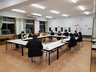 来年度の修学旅行は、宝立小中学校と三崎中学校と合同で行うことから、合同学習を行いました。修学旅行で仲良く行動し、楽しい思い出を作ることを目的に行いました。これまでの修学旅行に向けた各校の学びの発表やブレインストーミングなどを行い、互いのことを知り合うことができました。最後は円陣を組んで「みんなで楽しい修学旅行にしよう!」と気持ちを一つにすることができました。