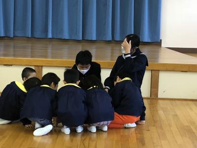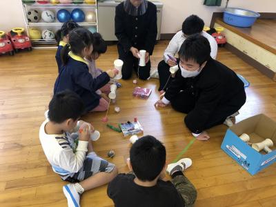 家庭科での学びを生かし、9年生が手作りのおもちゃで保育体験を行いました。紙で作ったけん玉は大好評で、夢中になって何度も挑戦する保育所の子どもたちの姿を見て、9年生もうれしそうでした。アンパンマンのパズルに集中して取り組む子や果物カードの絵合わせを仲良くよく楽しむ子どもたちの姿を見ながら、相手の思いに寄り添いながら活動することの楽しさを学んでいた様子でした。無邪気な笑顔と素直で元気な反応に、心地よい時間を過ごし、帰りの車の中では、「元気な反応があるってうれしい!」と語っていました。保育所長様はじめ保育士の皆様の優しいお心遣いのおかげで、充実した体験を行うことができましたことに、心より感謝申しあげます。本当にありがとうございました。