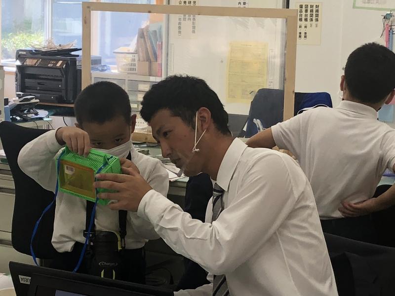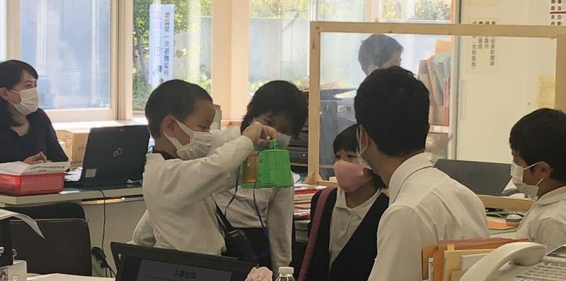 1・2年生が虫取りに出かけました。手でつかむことができず、虫かごに上手に誘いこむ作戦が成功したとか・・・。その虫たちを職員室で紹介してくれました。興味のあること、体験したことを伝える姿は必死で、素敵です。ほほえましい様子をご紹介します。