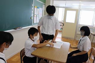 今日は、三崎中学校と交流学習を行いました。国語の授業では、ペア学習をしたり、机を合わせて4人で話し合ったりして、協働して学ぶことで、自分の考えを深めていました。また、総合的な学習の時間では、大谷チャームの制作を一緒に行いました。三崎中学校の生徒のみなさんに作り方やコツを教えることで、自然と会話が弾んでいました。