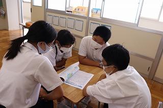 来年度の修学旅行は、宝立小中学校と三崎中学校と合同で行うことから、合同学習を行いました。修学旅行で仲良く行動し、楽しい思い出を作ることを目的に行いました。これまでの修学旅行に向けた各校の学びの発表やブレインストーミングなどを行い、互いのことを知り合うことができました。最後は円陣を組んで「みんなで楽しい修学旅行にしよう!」と気持ちを一つにすることができました。