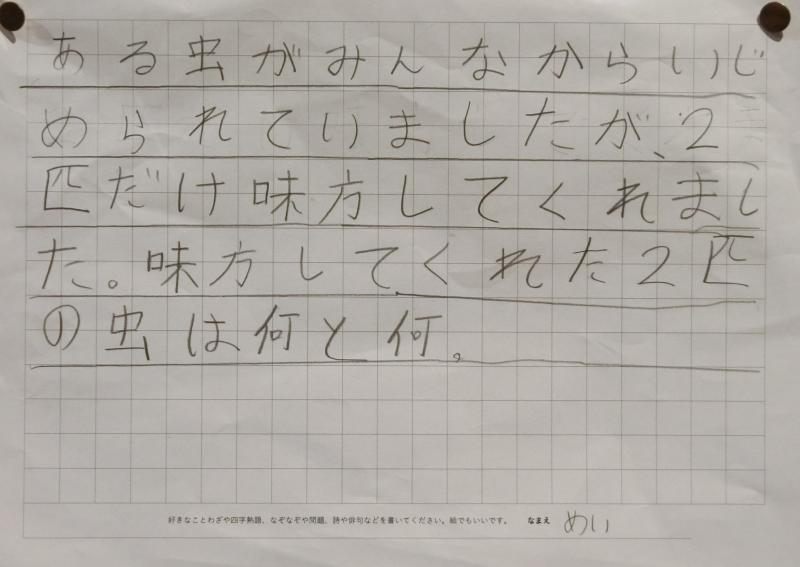 今日のひと言は、5年生のめいさんです。「なぞなぞシリーズ」が続きますが、みなさんはおわかりでしょうか。