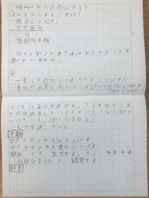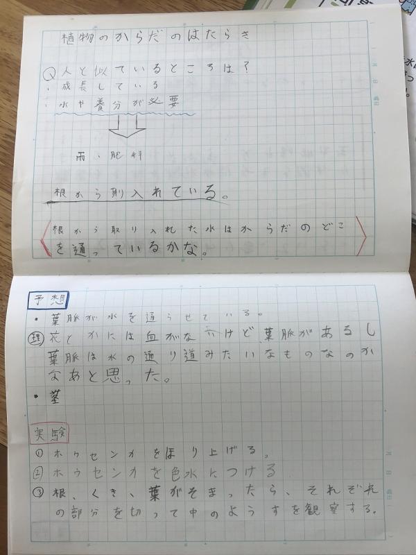 6年生は、理科の授業で、「植物はどのように水を吸い上げるかについて」学習しました。予想を立て、ICTを活用して、様々な実験の様子を見て、自分の考えの変容を認識しながら考えをまとめる授業でした。その時のノートをご紹介します。問から課題意識をもち、予想をたてて自分の考えをもっている点が素晴らしいです。