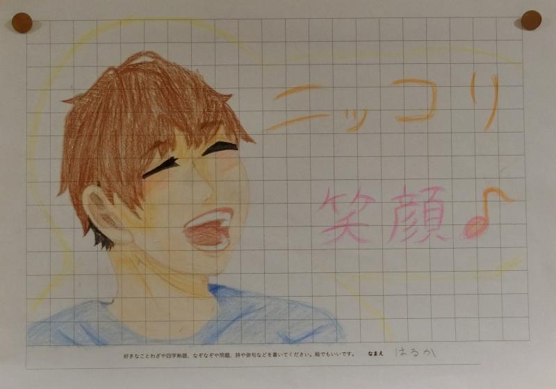 今日のメッセージボードは8年生のはるかさんのイラストです。笑顔っていいですよね。癒されます。