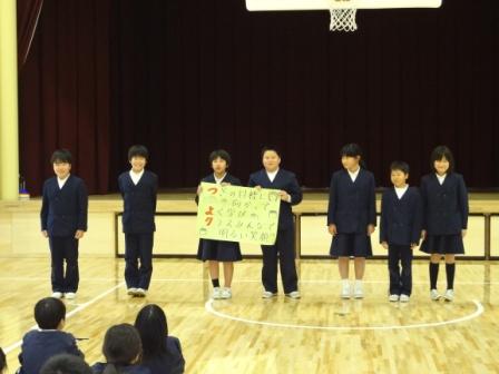 避難所で生活している子どもたちは、学校で過ごす時間も含め、24時間仲間と生活を共にしています。楽しいそうです。なぜなら一緒に遊ぶ時間が増えたからとのことです。確かに、ボランティアのお兄さんたちとおにごっこやかくれんぼをしています。外でも遊んでもらっています。夕食前の6時ごろ、子どもたちは、走ってはいけない廊下を笑顔で思い切り走り、しかられたりもしています。そんな中で、よりよい生活をめざして、避難所生活3か条をつくり、集会で披露してくれました。自治の力をつけていくきっかけとなりそうです。考え、行動し、呼びかける姿が大切です。